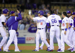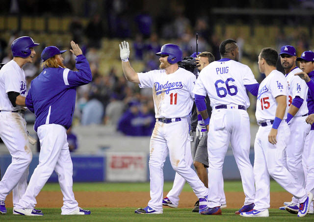 Dodgers third baseman Logan Forsythe (11) celebrates with third