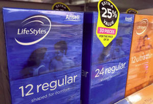 Boxes of Ansell condoms are displayed for sale at a local pharmacy