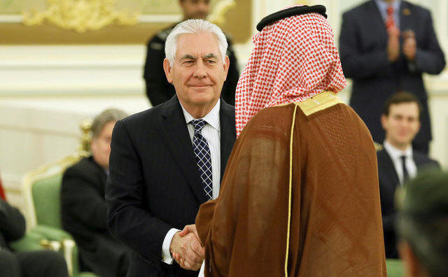 U.S. Secretary of State Rex Tillerson (C) shakes hands with a