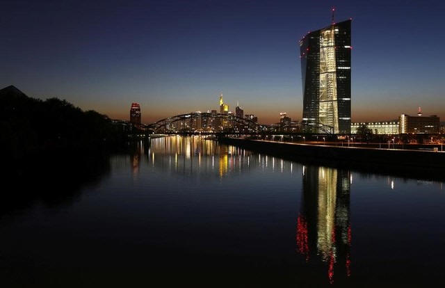 The headquarters of the European Central Bank (ECB) (R) is seen next