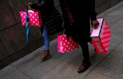People walk with shopping bags in Manhattan, New York City, U.S.