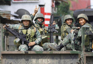 Philippine Marines smile at the media near the stronghold of Maute