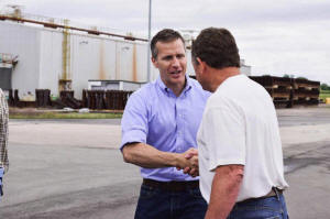 Missouri Governor Eric Greitens seen at an industrial site in this