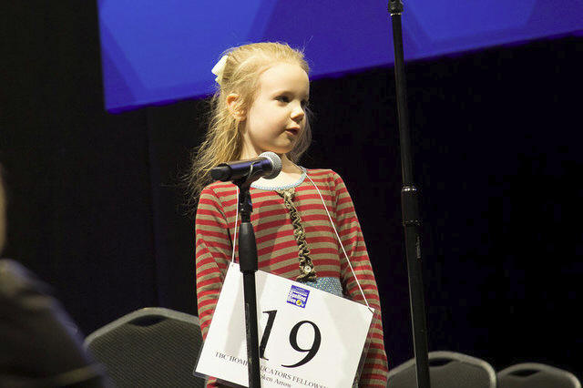 spelling bee. Her smiling face and blonde curls appear in a photograph