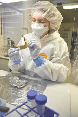 Scientist Verena Schuenemann is shown examining the lower jaw bone