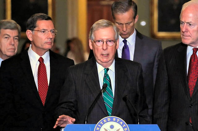 U.S. Senate Majority Leader Mitch McConnell (R-KY) (C), flanked by