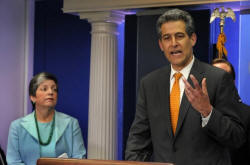 Dr. Richard Besser (R) makes remarks to the media as U.S. Secretary