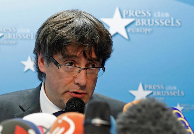 Sacked Catalan leader Carles Puigdemont attends a news conference at