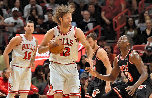 Bulls center Robin Lopez (42) is guarded by Miami Heat center Bam