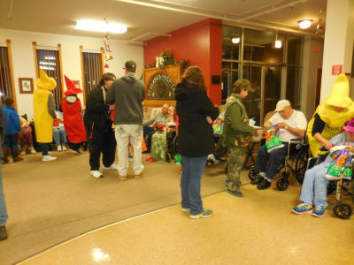 residents dressed up in their own Halloween costumes, lined the