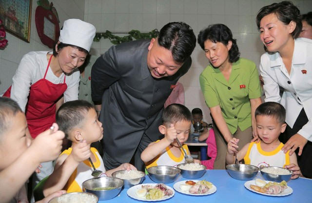 North Korean leader Kim Jong Un smiles as children eat during his