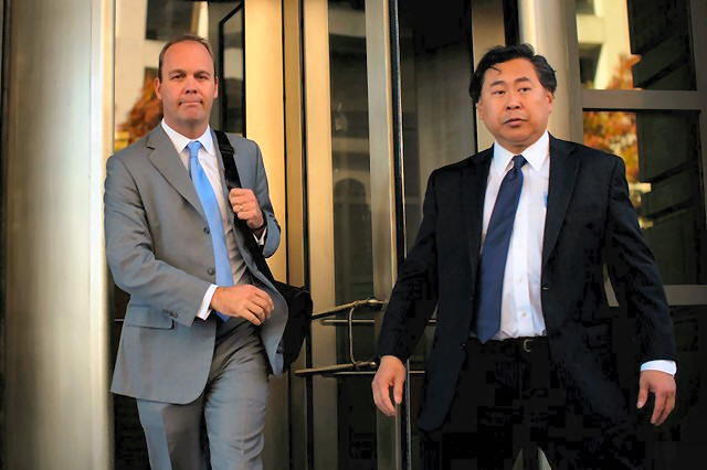departs with his attorney Shan Wu, after a status conference at U.S.