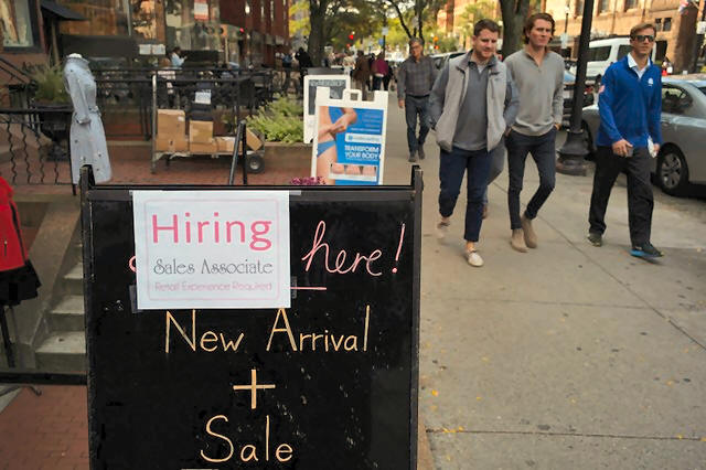 Pedestrians pass a sign advertising a sale and a job opening at a