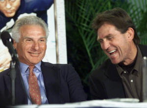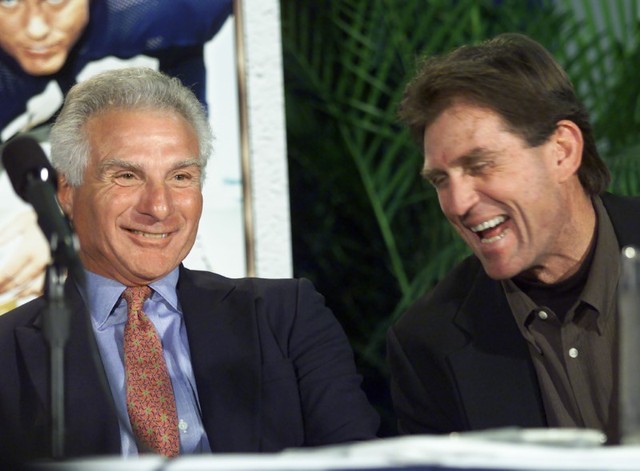 Patriots and Miami Dolphins linebacker Nick Buoniconti (L) shares a