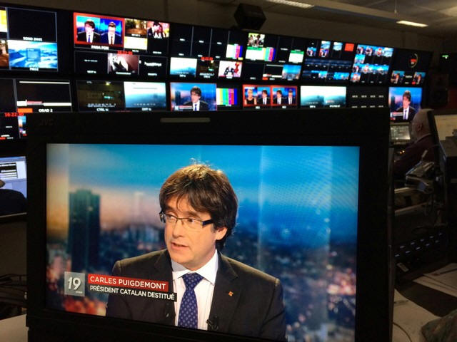 Ousted Catalan President Carles Puigdemont appears on a monitor