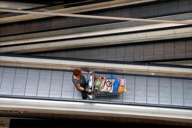 A customer pushes a shopping trolley on an escalator at the Bercy shopping centre in Charenton Le Pont, near Paris, August 29, 2013. REUTERS/Charles Platiau/File Photo |