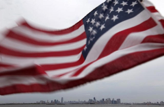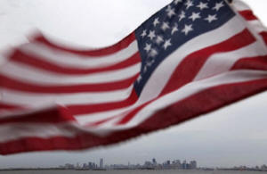 A U.S. flag flutters over top of the skyline of New York (R) and