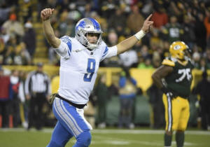 Lions quarterback Matthew Stafford celebrates after throwing a