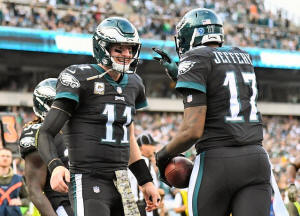 rushed for 77 yards on eight carries and one touchdown in his Eagles