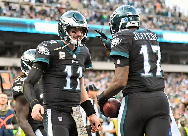 Eagles quarterback Carson Wentz (11) celebrates his 4-yard