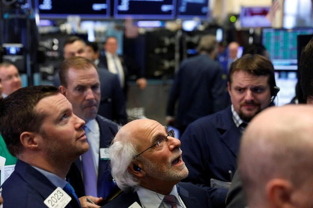 Traders work on the floor of the New York Stock Exchange shortly
