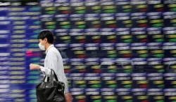 A man walks past an electronic stock quotation board outside a