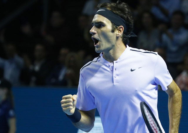 Roger Federer of Switzerland reacts after winning 2nd set during the