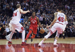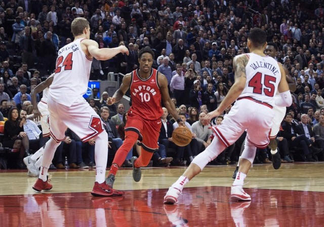 Raptors guard DeMar DeRozan (10) controls a ball as Chicago Bulls
