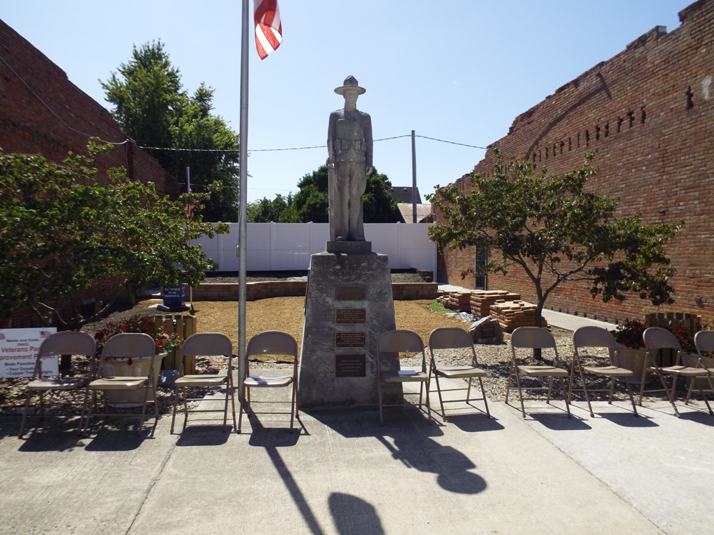 overtaken the broken brick surface. The WWI Doughboy statue is