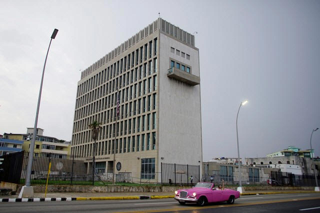 A car with tourists drives past the U.S. Embassy in Havana, Cuba,