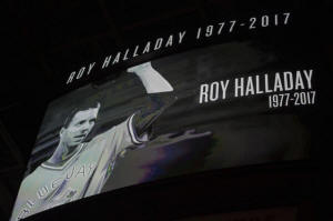 A tribute is played on the scoreboard for former Toronto Blue Jays