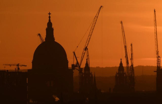 Construction cranes are seen by St Paul's cathedral at dawn in