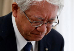 Kobe Steel President and CEO Hiroya Kawasaki bows as he meets with