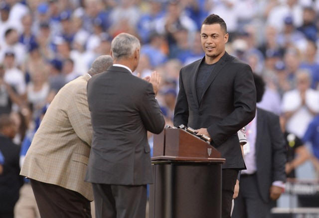Marlins outfielder Giancarlo Stanton is greeted by MLB commissioner