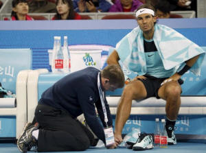Rafa Nadal of Spain receives medical treatment on his foot during the