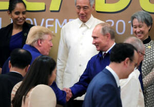 President Donald Trump and Russian President Vladimir Putin shake