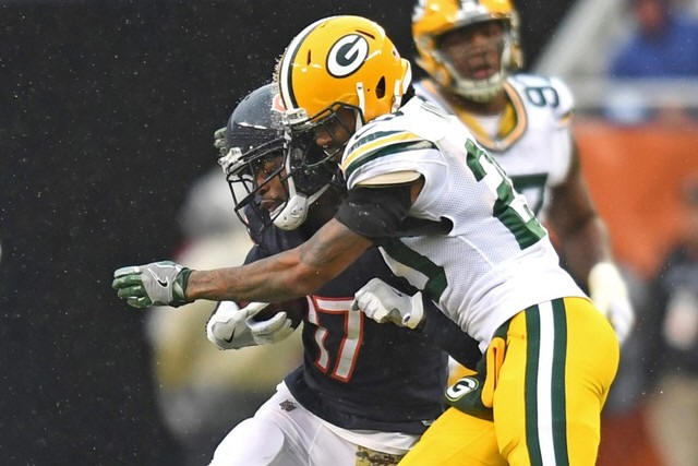 Packers cornerback Kevin King (20) tackles Chicago Bears wide