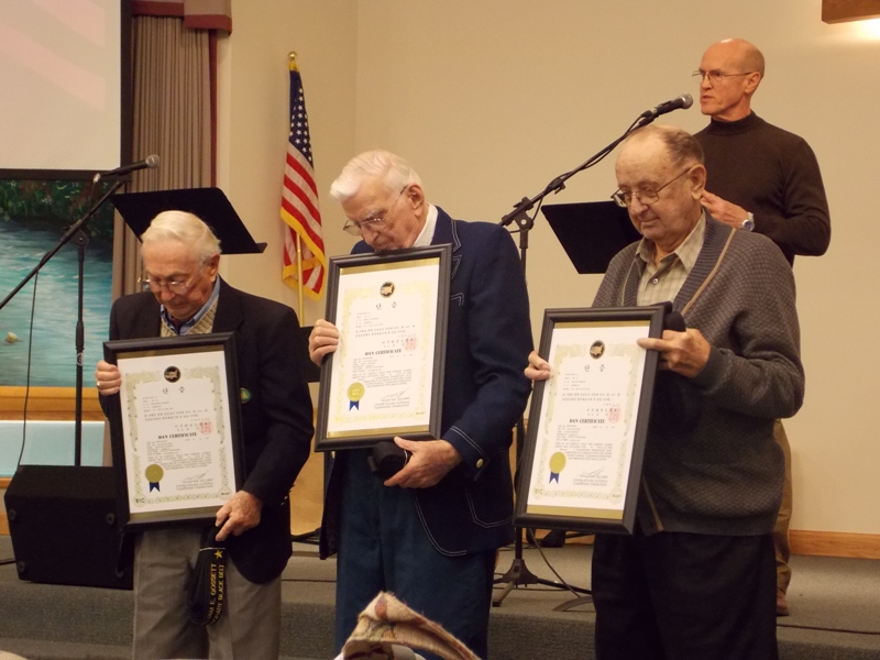 Master Instructor of Lincoln Tae Kwon Do, Scott Brown, did the honors of bestowing Bill Gossett, Orville Schaffer and Wayne Sheley with black belts with their names embedded, and large plaques designated as Dan Certificates.