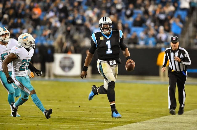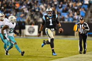 Carolina Panthers quarterback Cam Newton (1) runs as Miami Dolphins