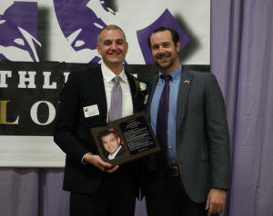 The third inductee of the evening was swimmer Josh Wegrzyn. Wegrzyn was in the Class of 2000 and he was a two-time NJCAA national champion and seven-time All-American at Lincoln College. Keith Tobin introduced Wegrzyn as his teammate who was “like a big brother to me” and said, “Josh is one of the most hardworking people I know. We have remained great friends.” Tobin also recalled the first time he met Wegrzyn, he was wearing a t-shirt that read, “Real men don’t quit.” Tobin never forgot that red t-shirt or that motto.