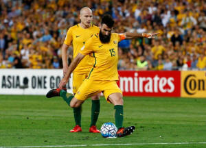 Australia’s Mile Jedinak scores their first goal from a free kick