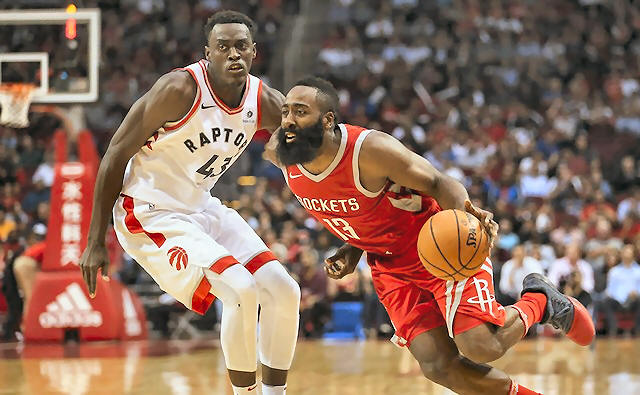 Rockets guard James Harden (13) dribbles the ball as Toronto Raptors