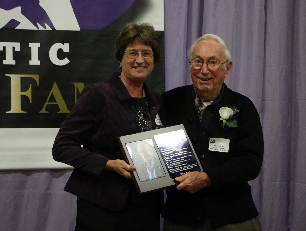 Pickering came to the podium one more time. The sixth inductee was “Friend of Athletics” Bill Gossett of Lincoln. Jan Bowers was scheduled to present to Gossett, but she had lost her voice, said Pickering, so the honor of pretending to be Bowers was bestowed on Pickering. Bowers did come to the stage to stand next to Pickering at his request. Bowers’ speech started with “My friendship began with Bill long before I even realized it.” She noted her childhood days of visiting Gossett’s Cleaners of Lincoln. Later in life as a member of the faculty at Lincoln College, Bowers observed Gossett as a Lincoln College Board of Trustee member and she said, “Bill loves everything about this school.” At 94 years old, Bill Gossett took the podium to accept the honor from Bowers and he was sporting his dad’s 1919 letter sweater. “It’s a special night,” said Gossett, referring to getting the sweater out of storage. “I appreciate this,” Gossett spoke of the honor. “When I am on campus I make it a point to stop and visit with our students.” He also said he will often ask students if they have a favorite instructor and often times they say, “Jan Bowers.”