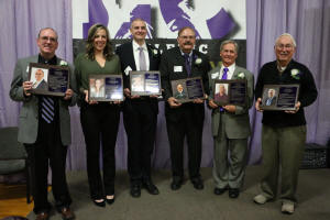 The 2017 Lincoln College Athletic Hall of Fame Class from left to right are Dan Hemenway, Brianne Nation, Josh Wegrzyn, Tom Zurkhammer, Bill Piskorski and Bill Gossett