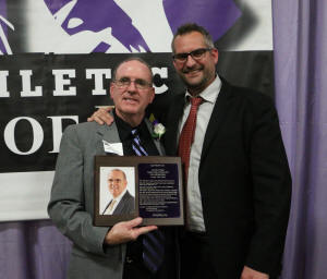 The third inductee of the evening was swimmer Josh Wegrzyn. Wegrzyn was in the Class of 2000 and he was a two-time NJCAA national champion and seven-time All-American at Lincoln College. Keith Tobin introduced Wegrzyn as his teammate who was “like a big brother to me” and said, “Josh is one of the most hardworking people I know. We have remained great friends.” Tobin also recalled the first time he met Wegrzyn, he was wearing a t-shirt that read, “Real men don’t quit.” Tobin never forgot that red t-shirt or that motto.