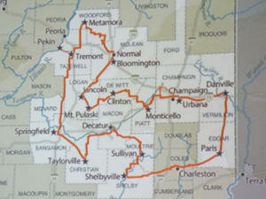 His circuit from 1847 to 1853 included Sangamon, Menard, Tazewell, Woodford, McLean, Logan, DeWitt, Champaign, Ford, Vermillion, Edgar, Shelby, Moultrie, Macon, and Christian counties.