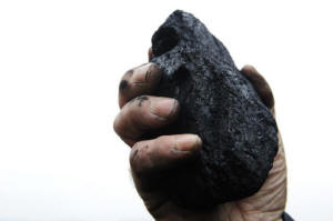 A coal merchant holds up a lump of coal for the camera in his yard