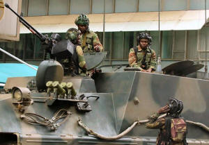 Soldiers are seen on the armoured vehicle outside the parliament in