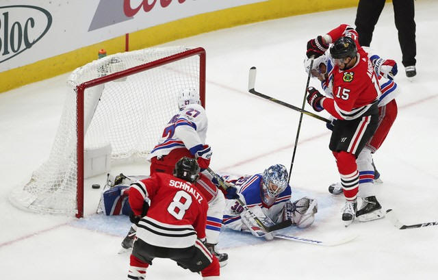 Blackhawks center Artem Anisimov (15) scores a goal against New York