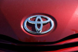 A Toyota logo is seen on a car at City Toyota in Daly
